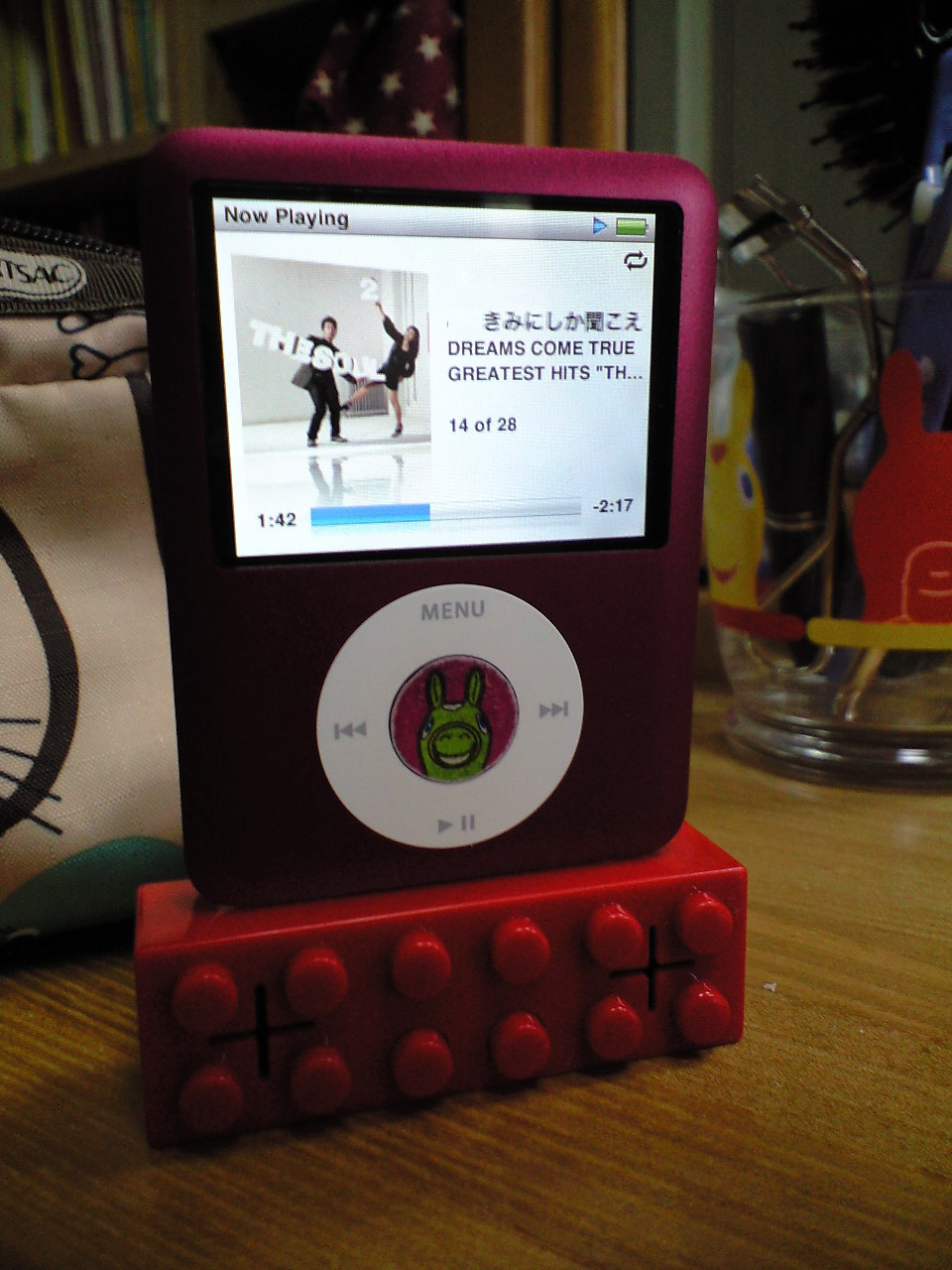 何やらレゴブロックみたいなのくっついてますけど。コイツ実はスピーカーです。真ん中下段のポッチ2つが音量調整ボタンになってます。小っこいけど音は結構デカいんだぜっ。ipodから電力供給するから電池要らず。欠点は、直立するけどすぐ倒れるトコ・・・・・・。
