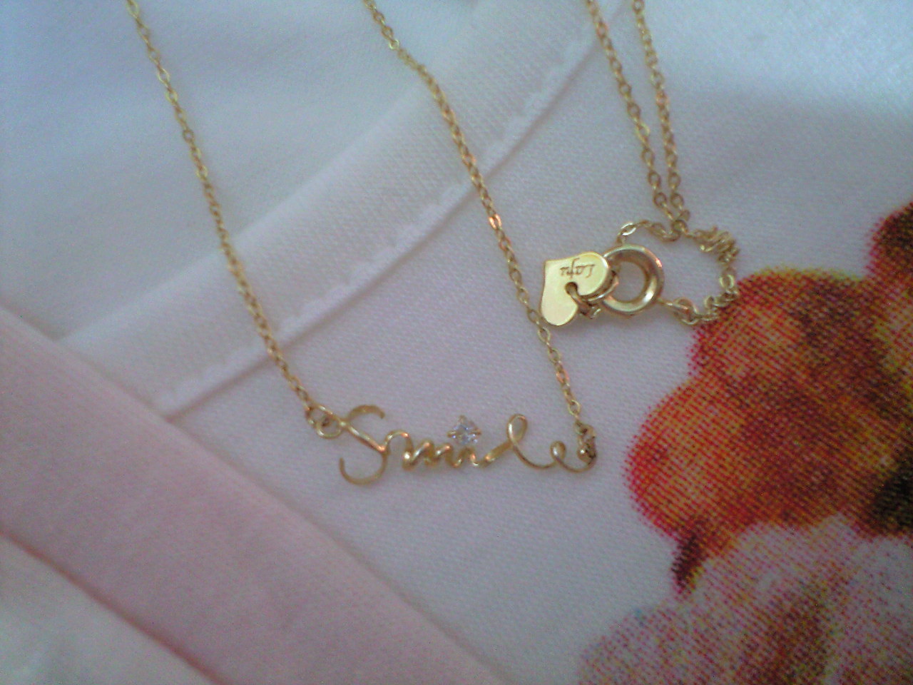Tシャツは2枚で3990円のセールだった。最初は1枚だけ買うつもりだったんだけど、「2枚でもっとお安くなるンですよォ~!」とか店員さんに言われちゃったら、「1枚でいいです」なんて言えないじゃないッ(小心者)!!帽子はこれまたセールで1500円。流行りものはあくまでも安さで勝負(笑)。ネックレスは拡大するとこんな感じ。↓